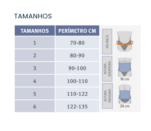 Fecho de ajuste na zona frontal em forma de micro gancho e veludo, placa de reforço no interior na zona abdominal, o ajuste é feito com a ajuda de dois passadores um do lado direito e outro no lado esquerdo, nestes passadores será introduzido uma das mãos em cada um dos lados, facilitando a colocação e o ajuste na correta medida que o paciente deseja.